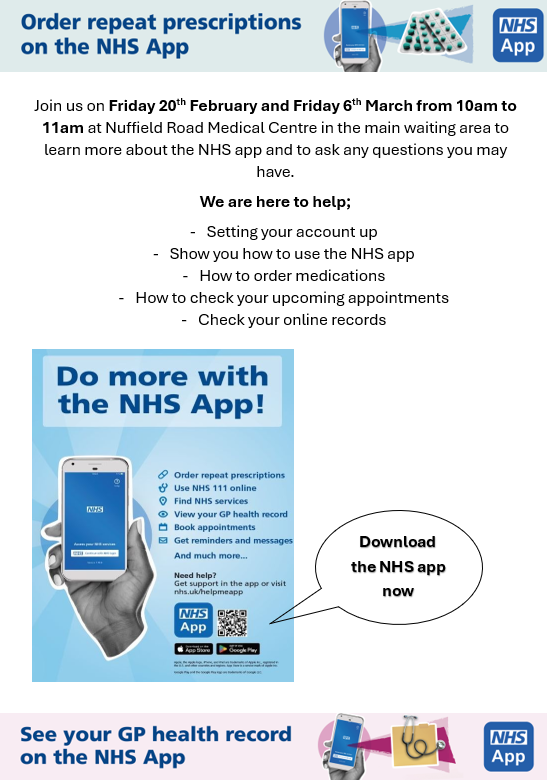 If you do not want to see your health record, or if you would like more information about these changes, please speak to a member of the Nuffield Road Medical Centre team.