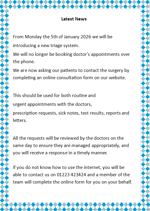Long Term Conditions - if you have received a letter about your Long Term Condition you can now call the team direct. The new number is 01223 422588