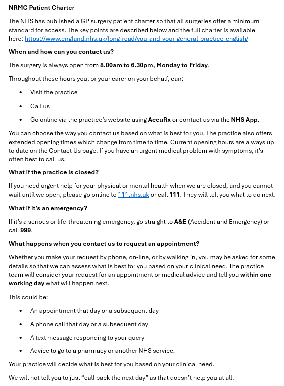 Whether you make your request by phone, on-line or visiting your practice, you may be asked to give your practice some details so that they can assess what is best for you based on your clinical need. The practice team will consider your request for an appointment or medical advice and tell you within one working day what will happen next.